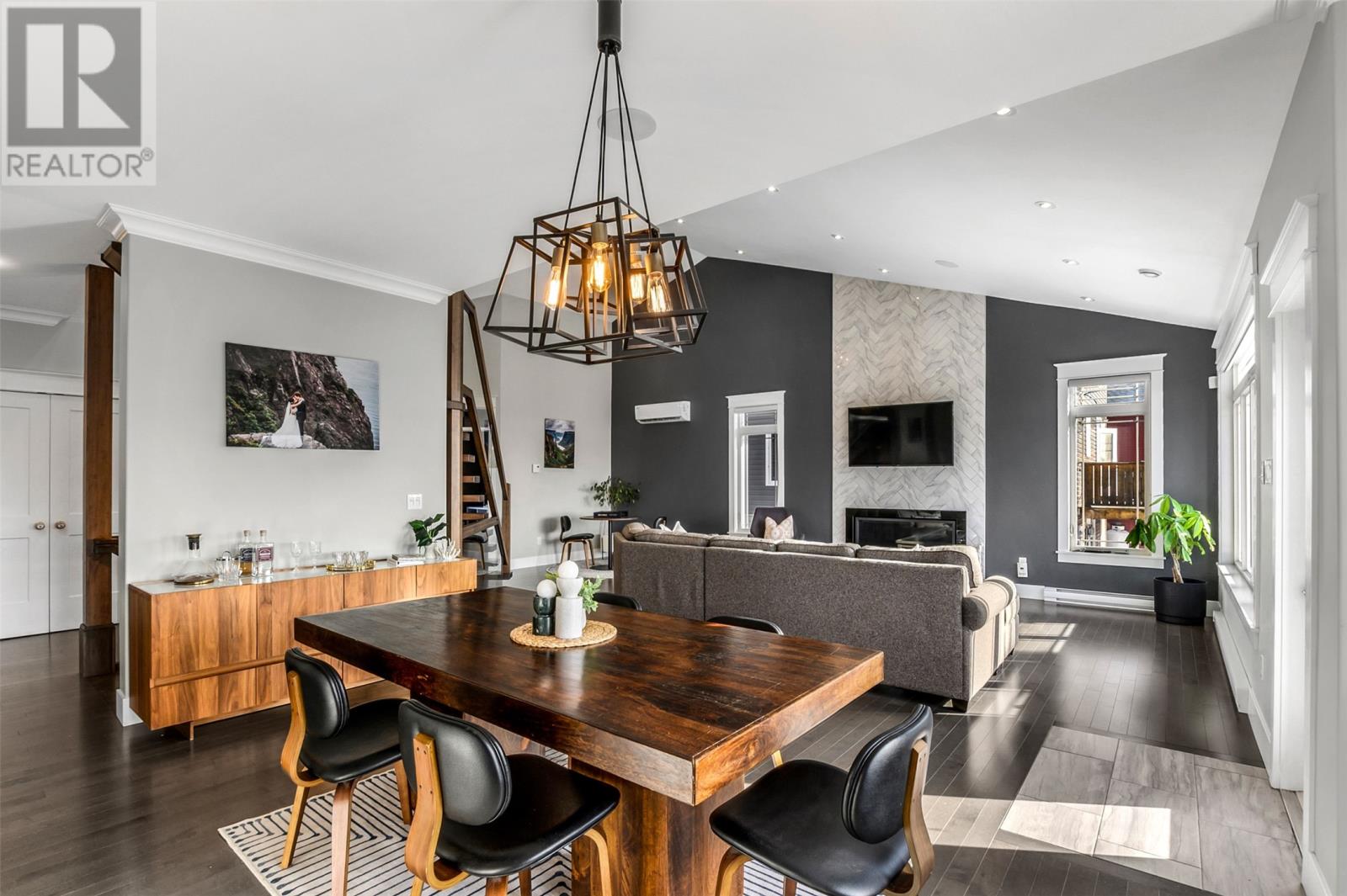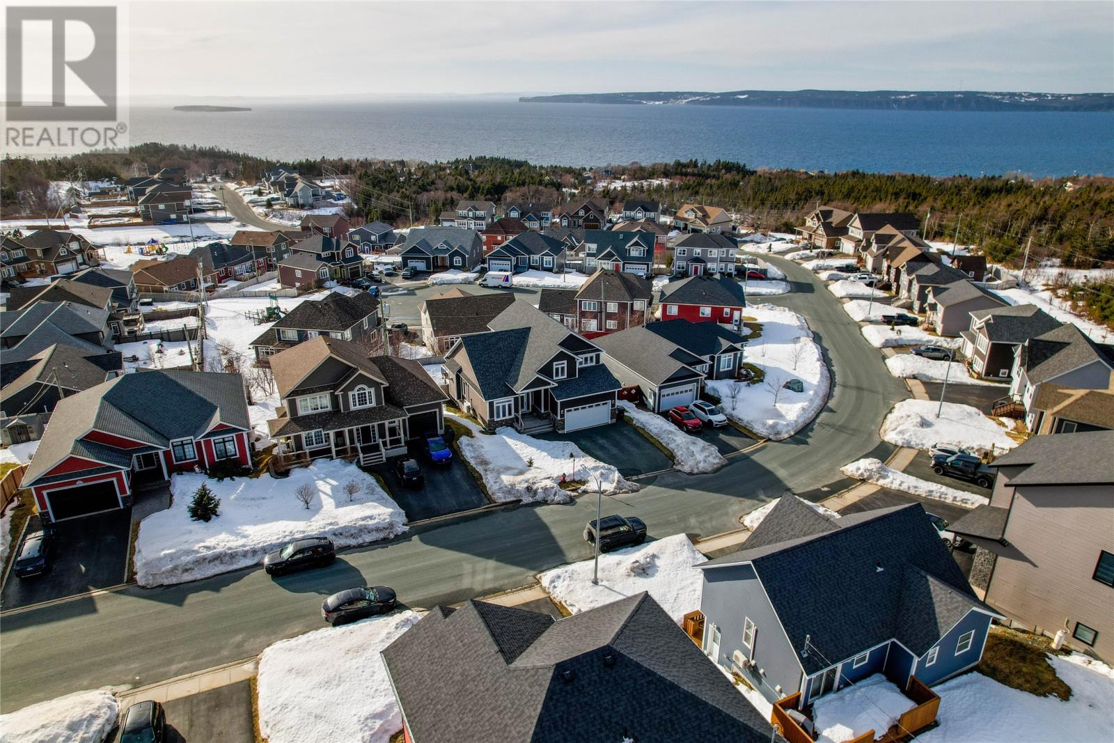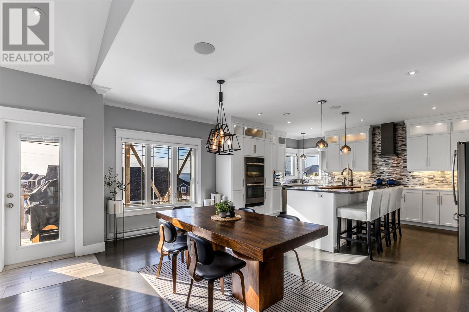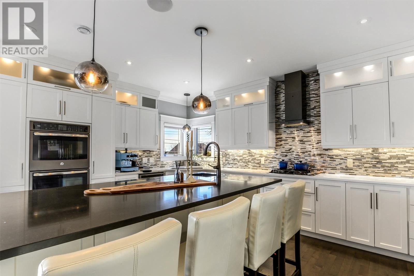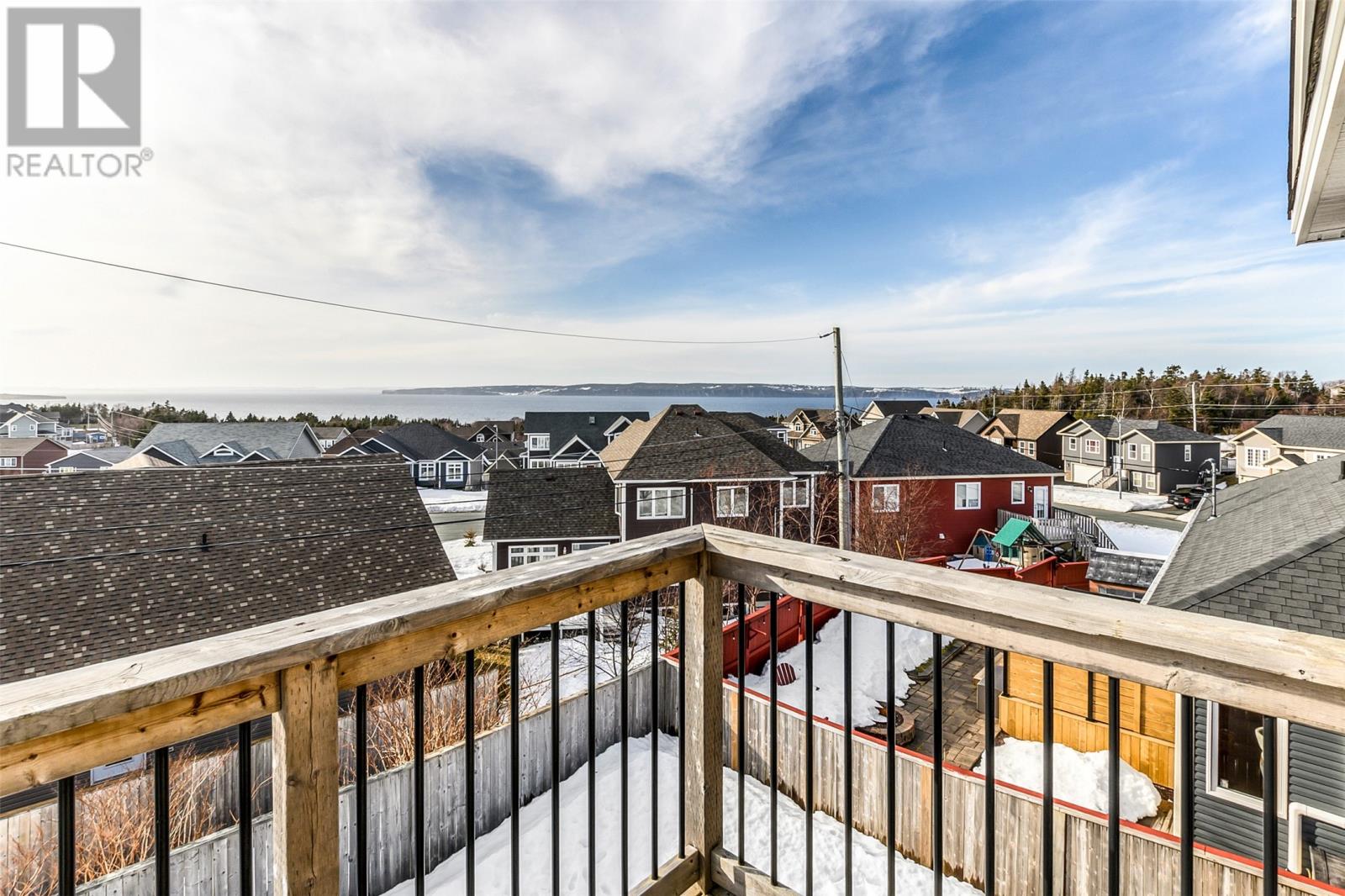 Absolutely stunning custom-built two-storey home with a two-car attached garage, located in Island View Estates and offering panoramic ocean views of Bell Island and Conception Bay. The bright main floor features vaulted ceilings and expansive windows that fill the space with an abundance of natural light. Designed with an open-concept layout, the main level includes a spacious living room with an elegant propane fireplace, a dining area, and a gourmet chefâs kitchen featuring ceiling-height cabinetry, quartz countertops, stainless steel appliances, a stylish backsplash, and a large island with access to the rear patio. A cozy den (currently used as a home office), powder room, and convenient laundry room with a custom tiled dog bath complete the main floor. An exquisite custom-built staircase leads to the upper level, which houses three spacious bedrooms and a main four-piece bathroom. The oversized primary retreat features a walk-in closet, a spa-inspired four-piece ensuite with double vanity and glass shower, and a private balcony to take in the incredible views. The fully developed, bright walk-out basement features large windows and includes a recreation room, sauna, fourth bedroom (currently used as a home gym), bonus room (currently used for storage), a four-piece bathroom, and ample storage space. This immaculate home is complete with two mini-split systems for efficient heating and cooling, heated flooring in the bathrooms, and custom-made Hunter Douglas window coverings throughout. Sure to impress! No conveyence of offers until Monday, March 23 @ 4:00pm and left open for acceptance unitl 9:00pm the same day (id:58149)